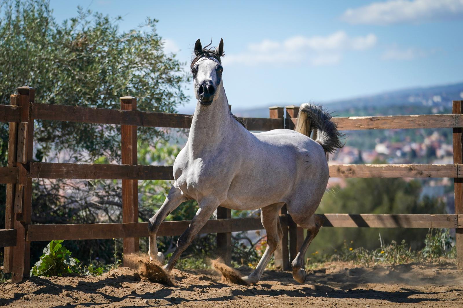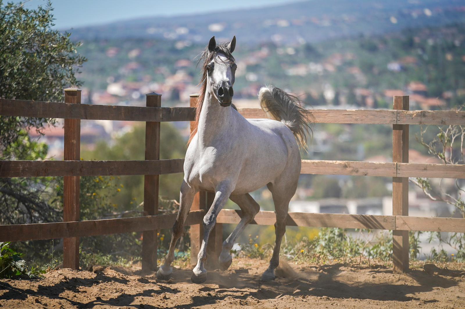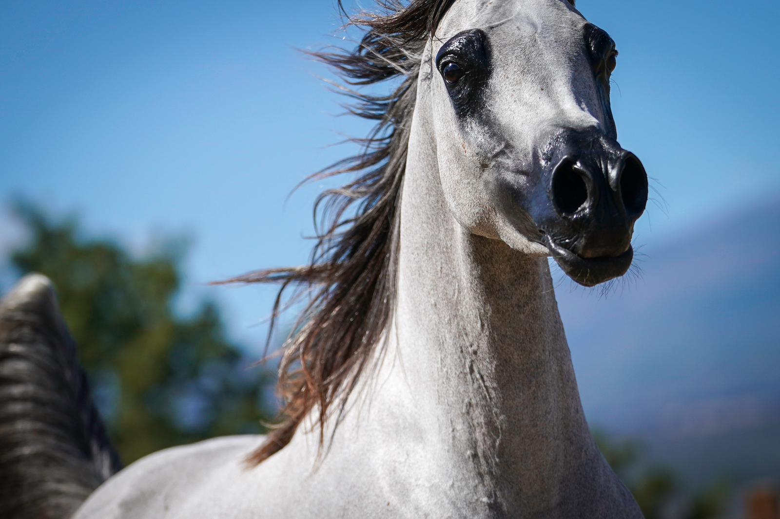 Eilexa is a striking white Arabian mare with deep dark eyes and a black muzzle that beautifully contrast her luminous coat. Her refined head, arched neck, and balanced conformation reflect the classic elegance of the Arabian breed. She moves with lightness and grace, her stride fluid and proud. In every step, Eilexa carries the spirit, beauty, and nobility of the desert